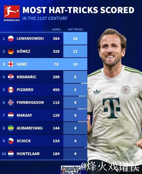 德甲最速完成10次帽子戏法排行榜:凯恩76场第一,盖德入榜